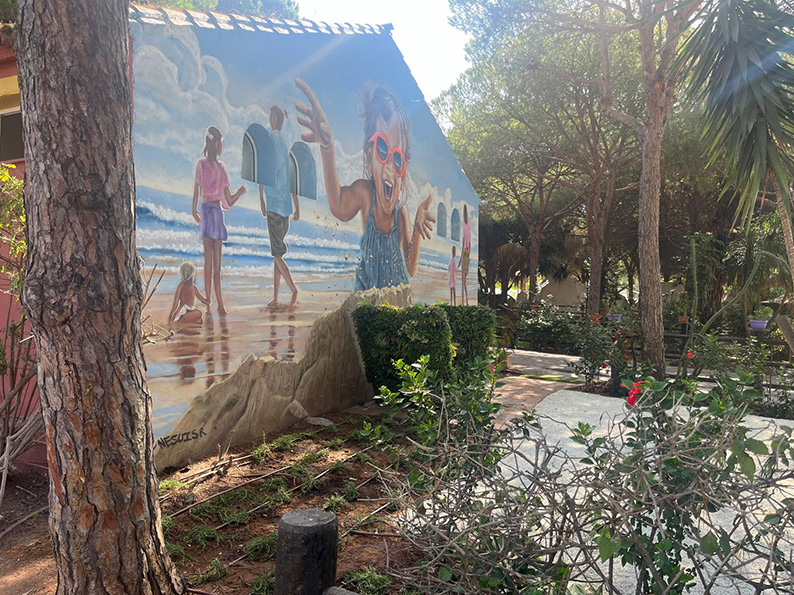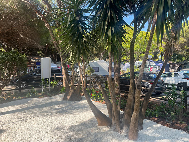 Decoramos una parcela para complementar un mural de bienvenida. Crear una pista central de gravilla rodeada de hibiscos vibrantes y un par de yucas en el centro logró un diseño armonioso y atractivo.
